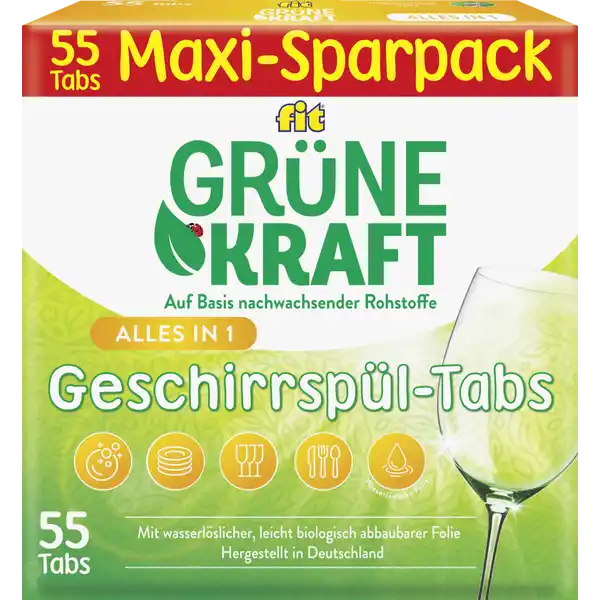 Fit Grüne Kraft All-in-1 tabs zajistí nejen čistotu vašeho nádobí, ale také ochranu životního prostředí. Jsou totiž vyráběny z obnovitelných surovin a jsou snadno biologicky odbouratelné. Vysoce aktivní složky šetrné k životnímu prostředí zajišťují dokonalou čistotu.