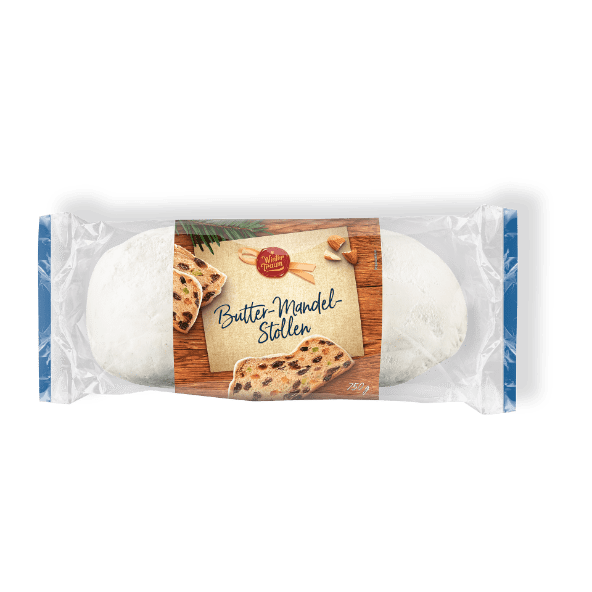 Wintertraum vánoční štola máslová mandlová 750 g. Plněná rozinkami, marcipánem a kandovaným ovocem v máslovém těstě. Dovezeno z Německa.